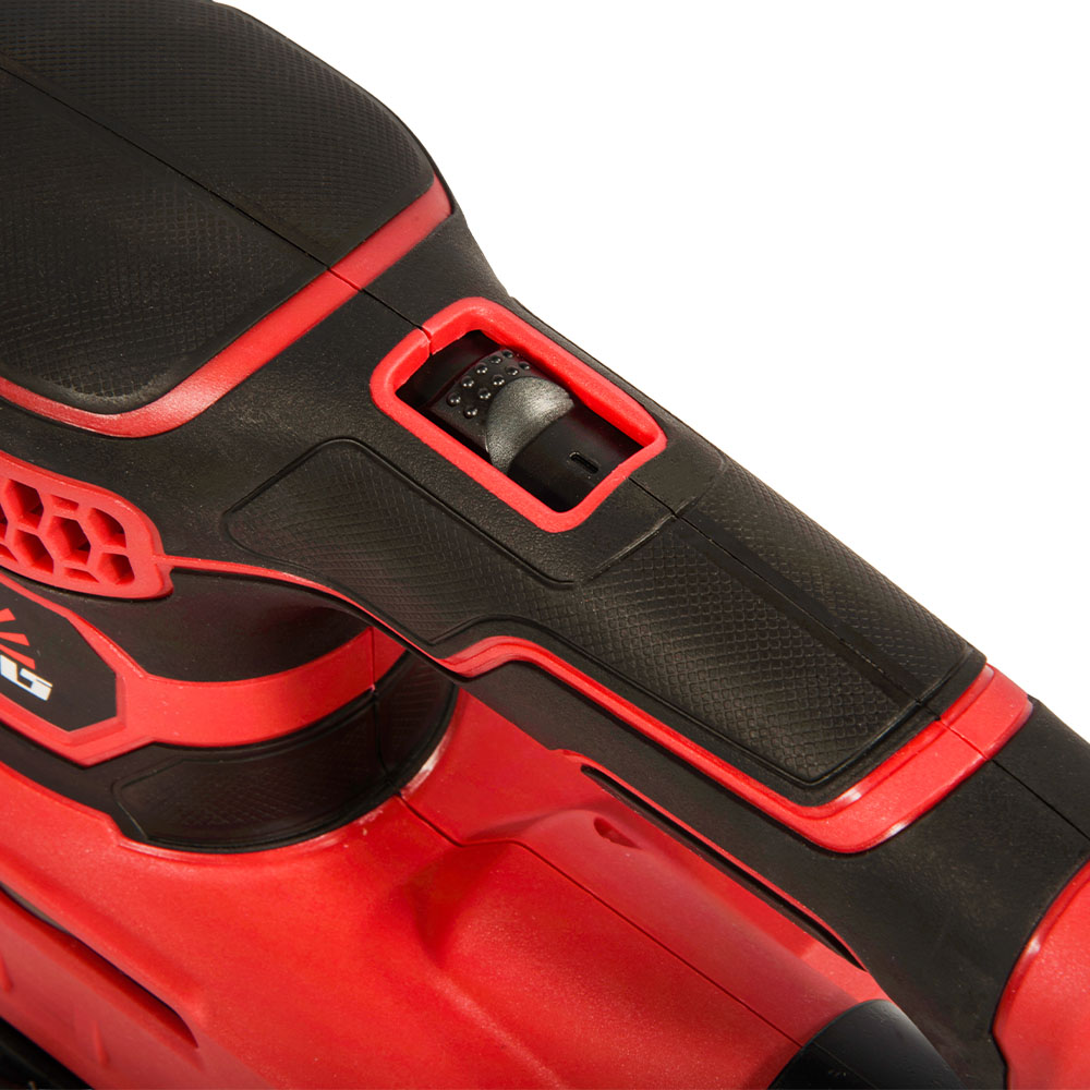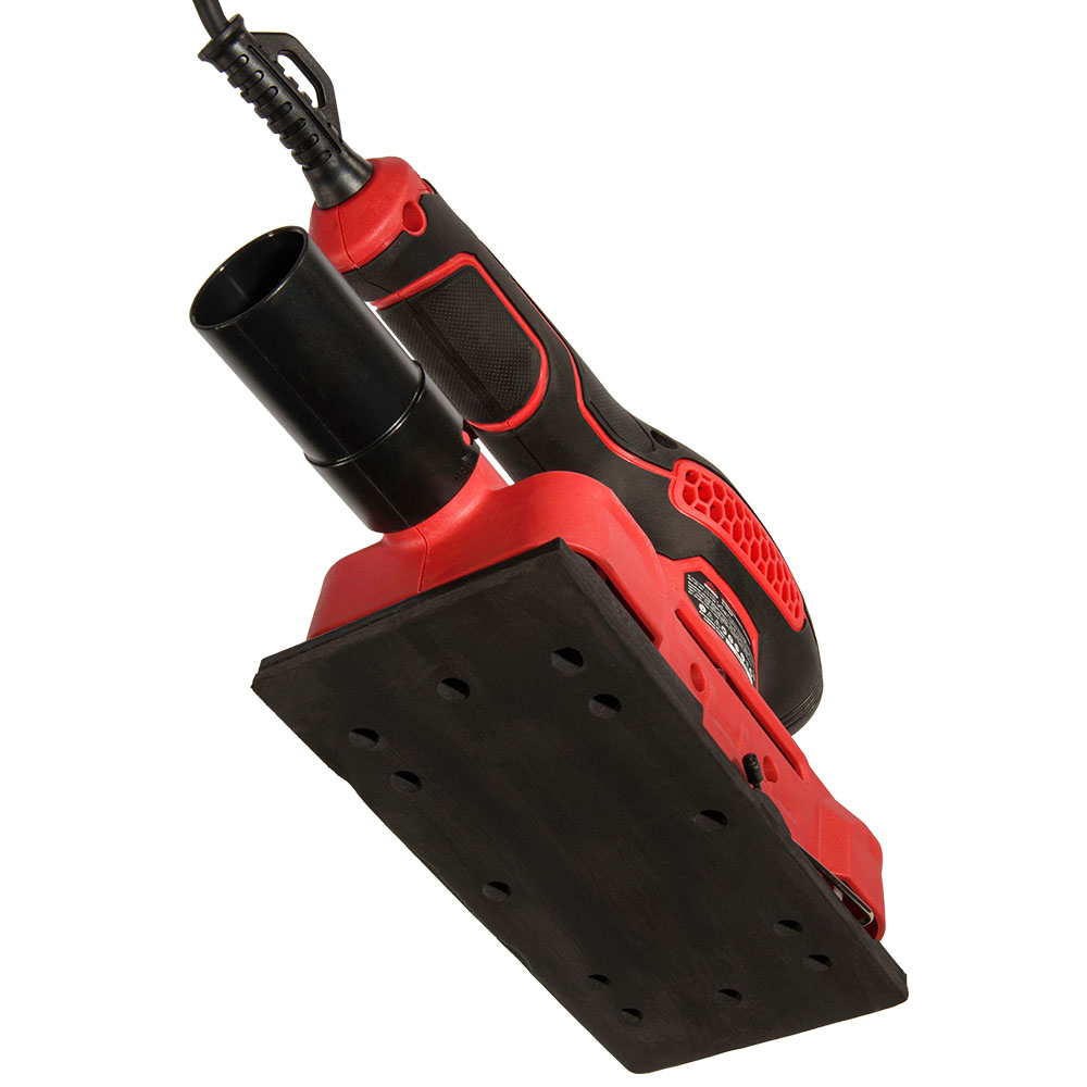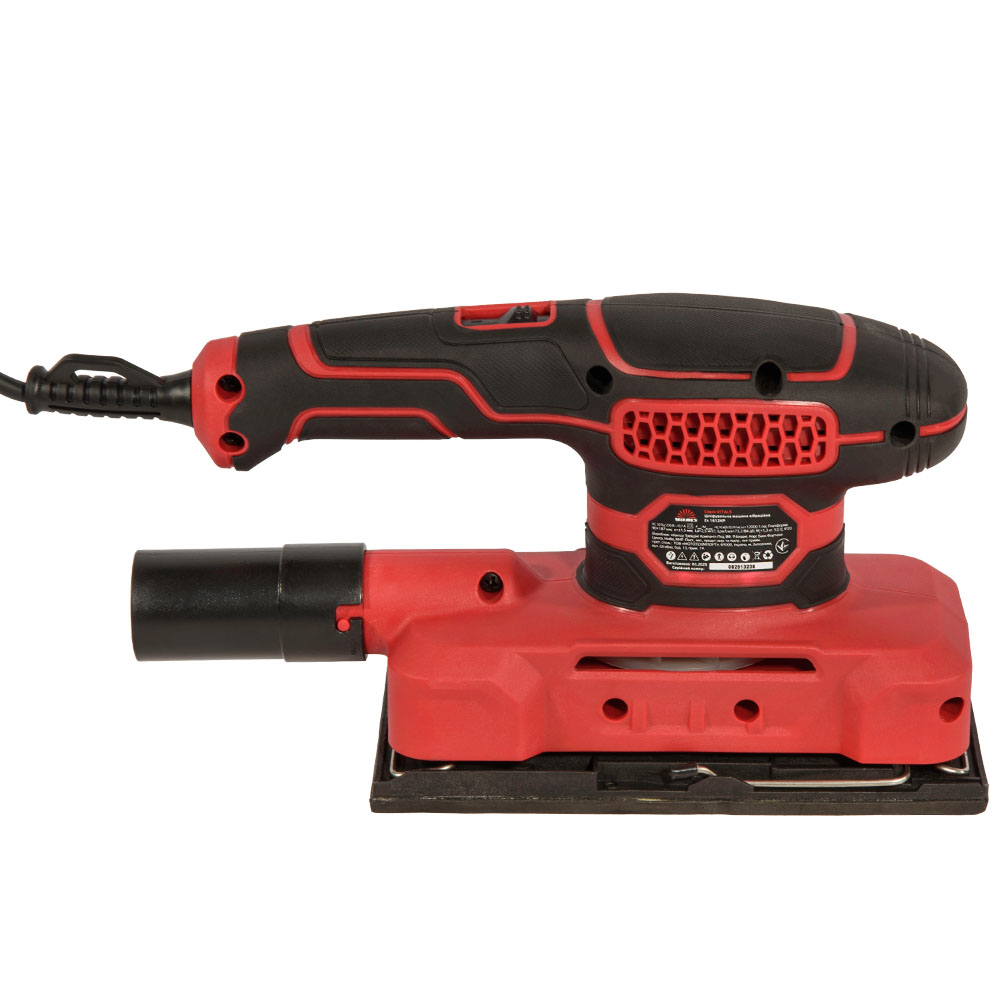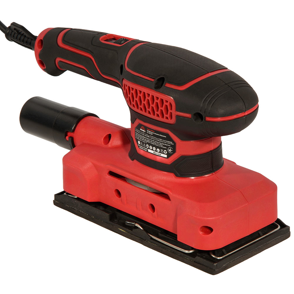 Конструкція виробу виконана в пластиковому несному корпусі, який містить колекторний електричний двигун, систему вентиляції та органи керування. Ексцентриковий механізм приводу змінної платформи із вільним підшипником, на відміну від трансформаторних або кривошипних приводів, дозволяє отримати складний циклічний рух прямокутної платформи, що дозволяє уникнути прямих рисок на обробленій поверхні. Від обертання платформу утримують гумові амортизатори. Система пиловідведення відбирає пил через вікна платформи, подає його на адаптер, який передбачає під’єднання пилосмока або текстильного/паперового мішка (до комплекту постачання виробу не входять).